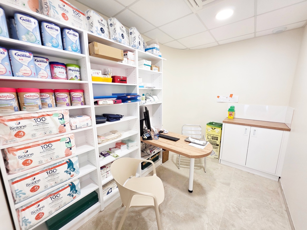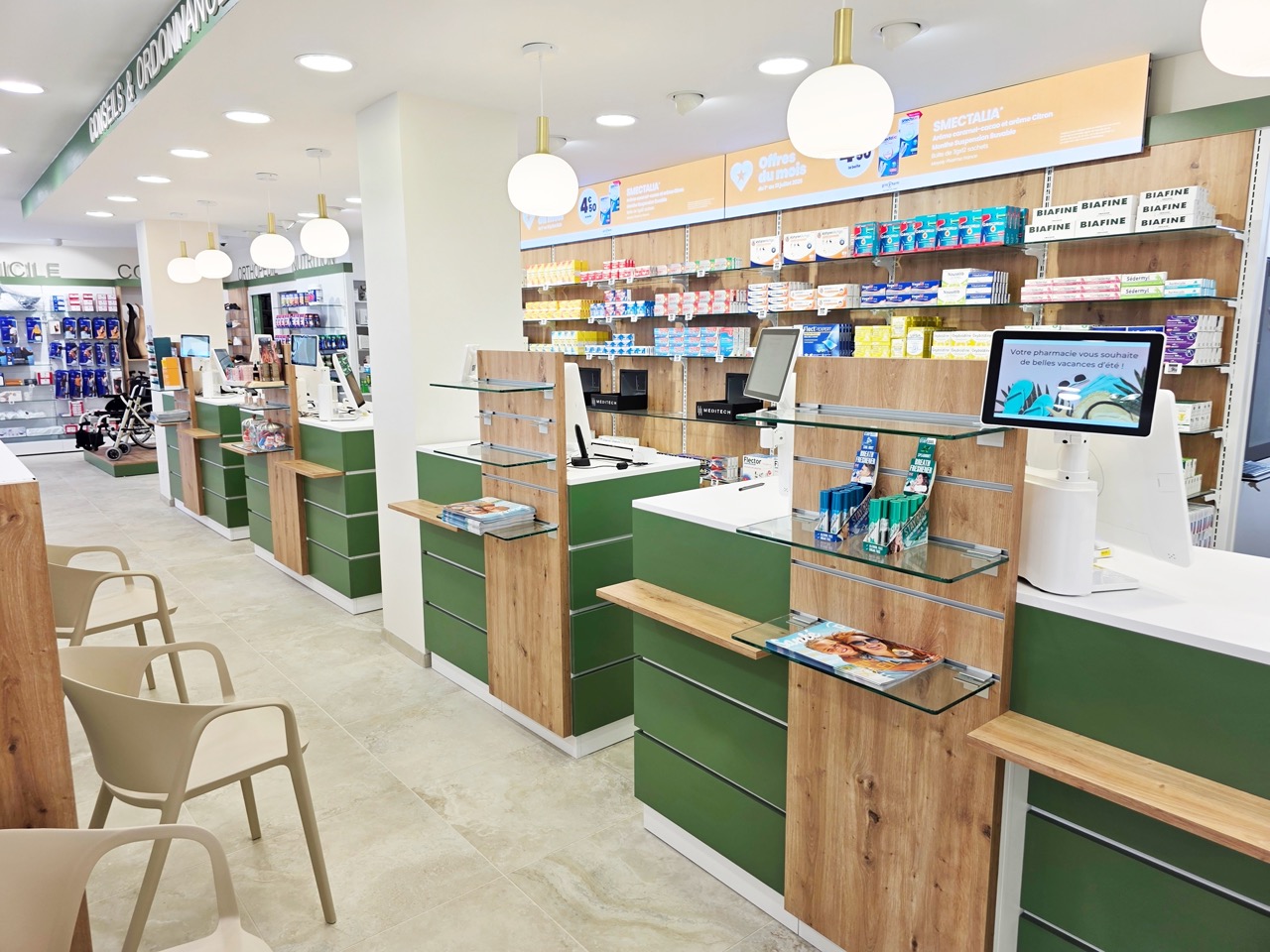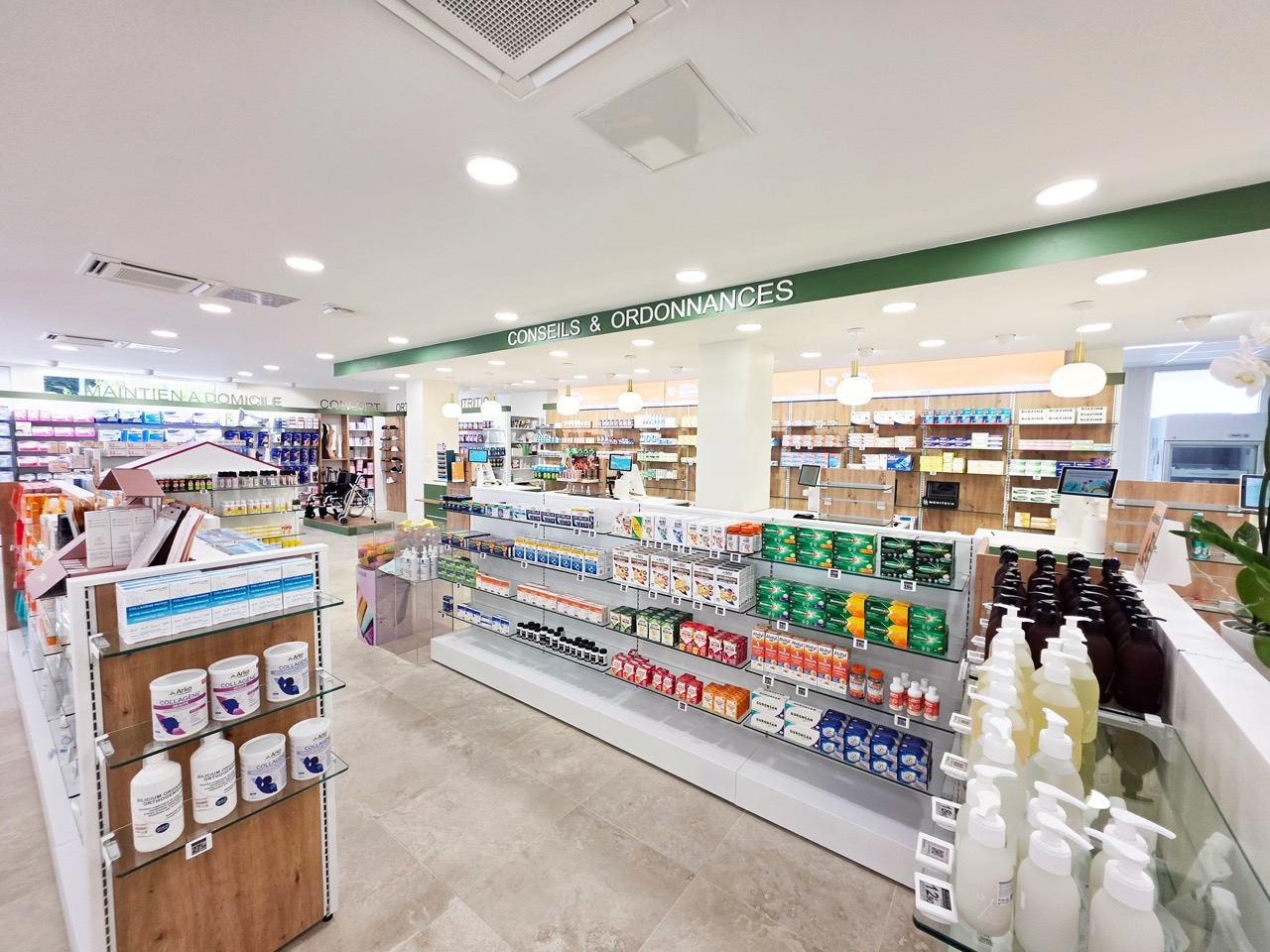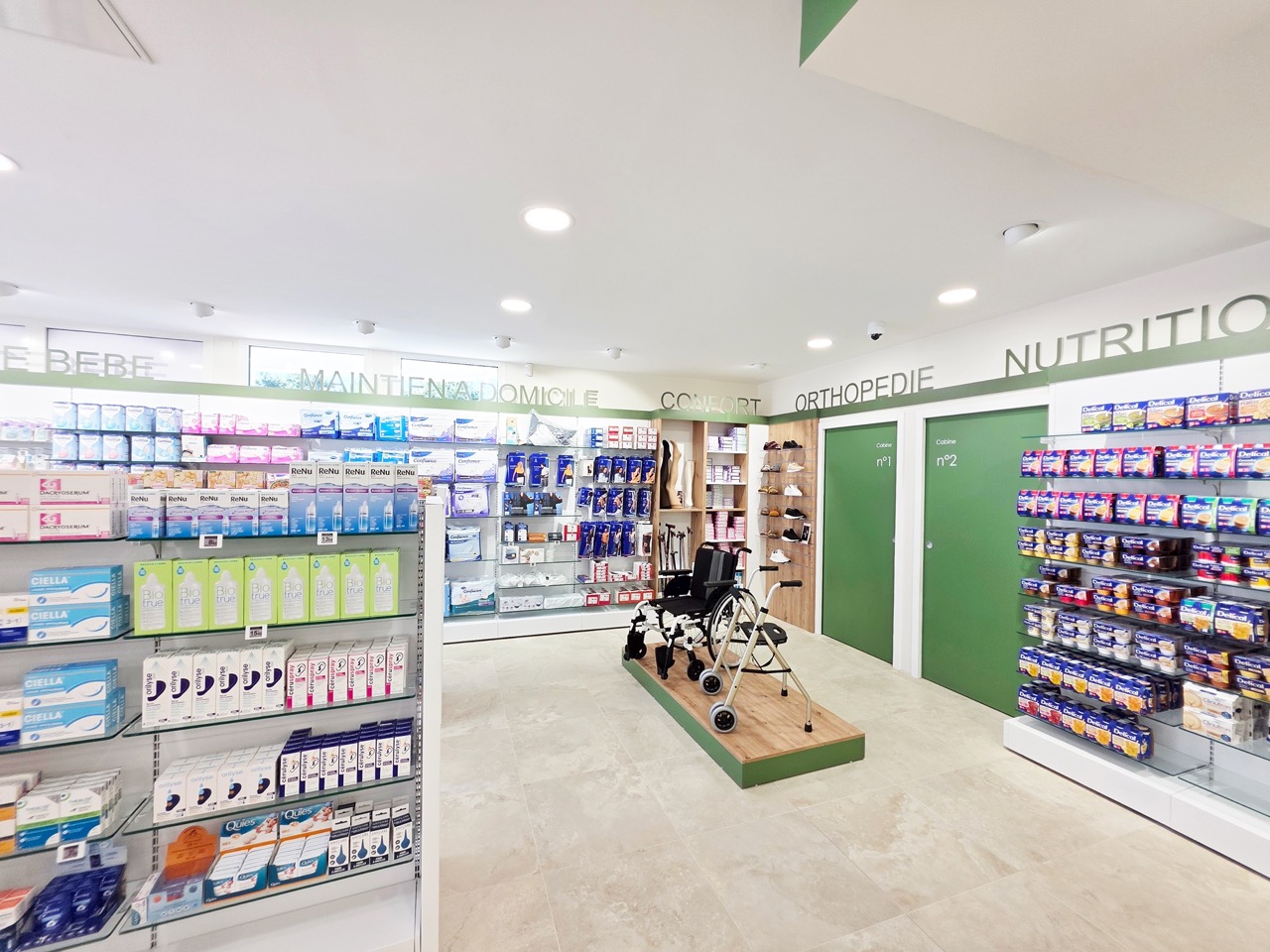 Cette localisation a naturellement orienté son offre de services. Des espaces spécialisés en oncologie et en orthopédie ont été intégrés, complétés par trois zones confidentielles dédiées à la vaccination et aux tests. L’organisation générale a été pensée pour répondre efficacement aux besoins d’un public fortement médicalisé, affirmant le rôle de la pharmacie comme un acteur de référence à l’échelle de la ville.