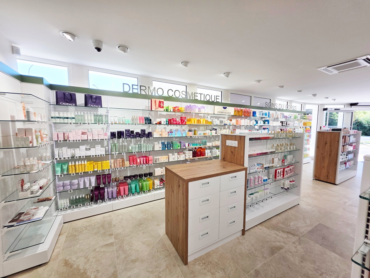 La configuration profonde du local a conduit à placer la lumière naturelle au cœur de la réflexion. L’installation de mobilier bas favorise sa diffusion dans l’ensemble de l’espace de vente, évitant toute sensation d’encombrement visuel. Le mobilier sur mesure associe le bois à des tablettes vertes, créant un équilibre entre modernité et esprit de pharmacie de proximité. L’agencement a été conçu pour offrir une lecture claire et fluide des espaces, dans une atmosphère volontairement sobre, lumineuse et apaisante.
