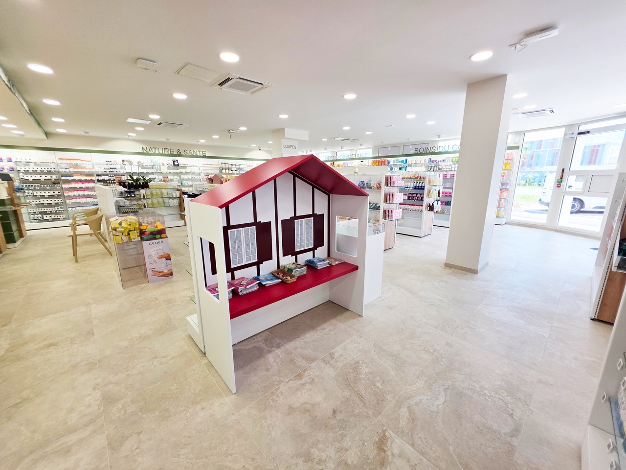 L’intégration d’un système de robotisation a structuré l’organisation globale de l’officine. Anticipé dès la phase de conception, cet équipement permet de réduire l’emprise du back-office au profit de la surface de vente, tout en améliorant l’ergonomie et la rapidité d’exécution des équipes. Le confort des collaborateurs a également été pleinement pris en compte, avec la création d’une cuisine, d’une salle de repos et d’un bureau vitré offrant une connexion visuelle avec l’espace de vente. Enfin, au coeur de l’espace de vente, une zone enfant entièrement sur mesure, conçu comme une cabane basque aux couleurs rouge, verte et blanche, apporte une signature typique et enrichit l’expérience des visiteurs.