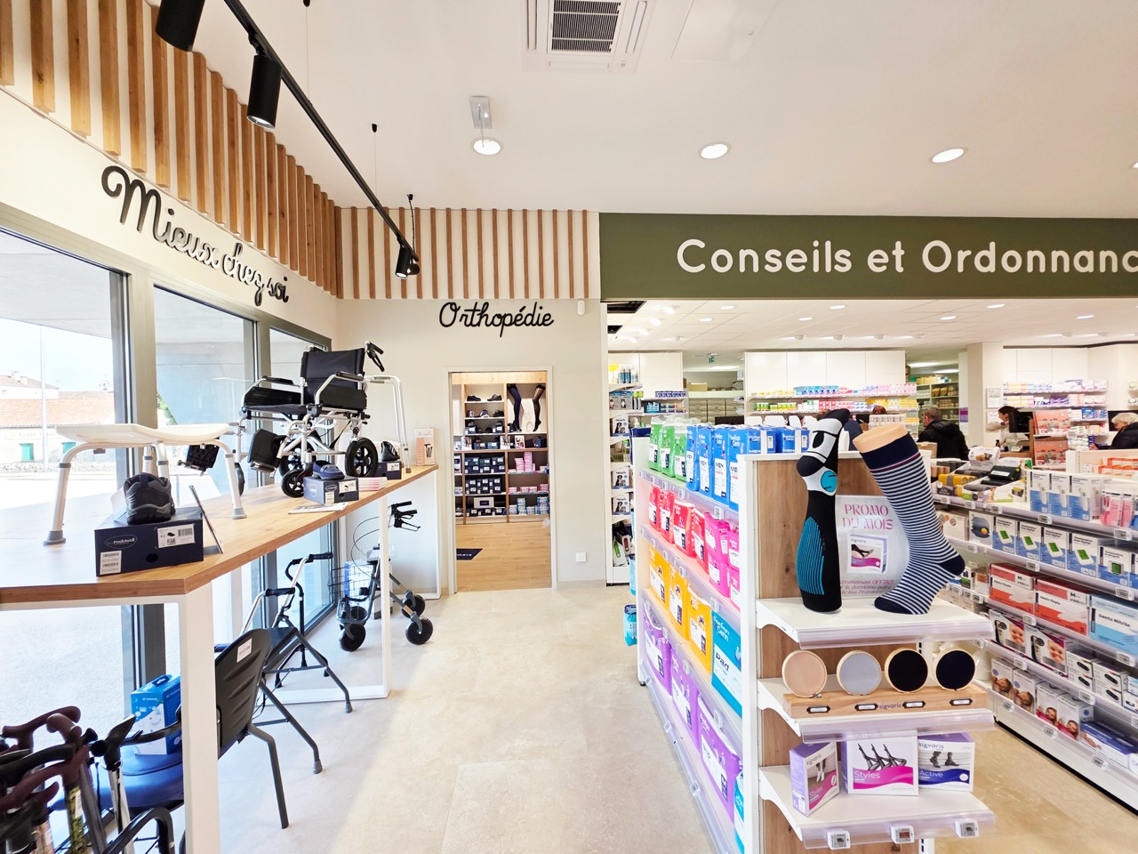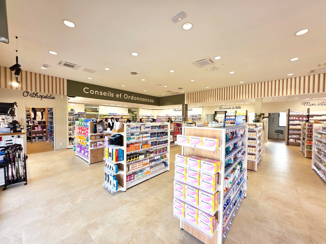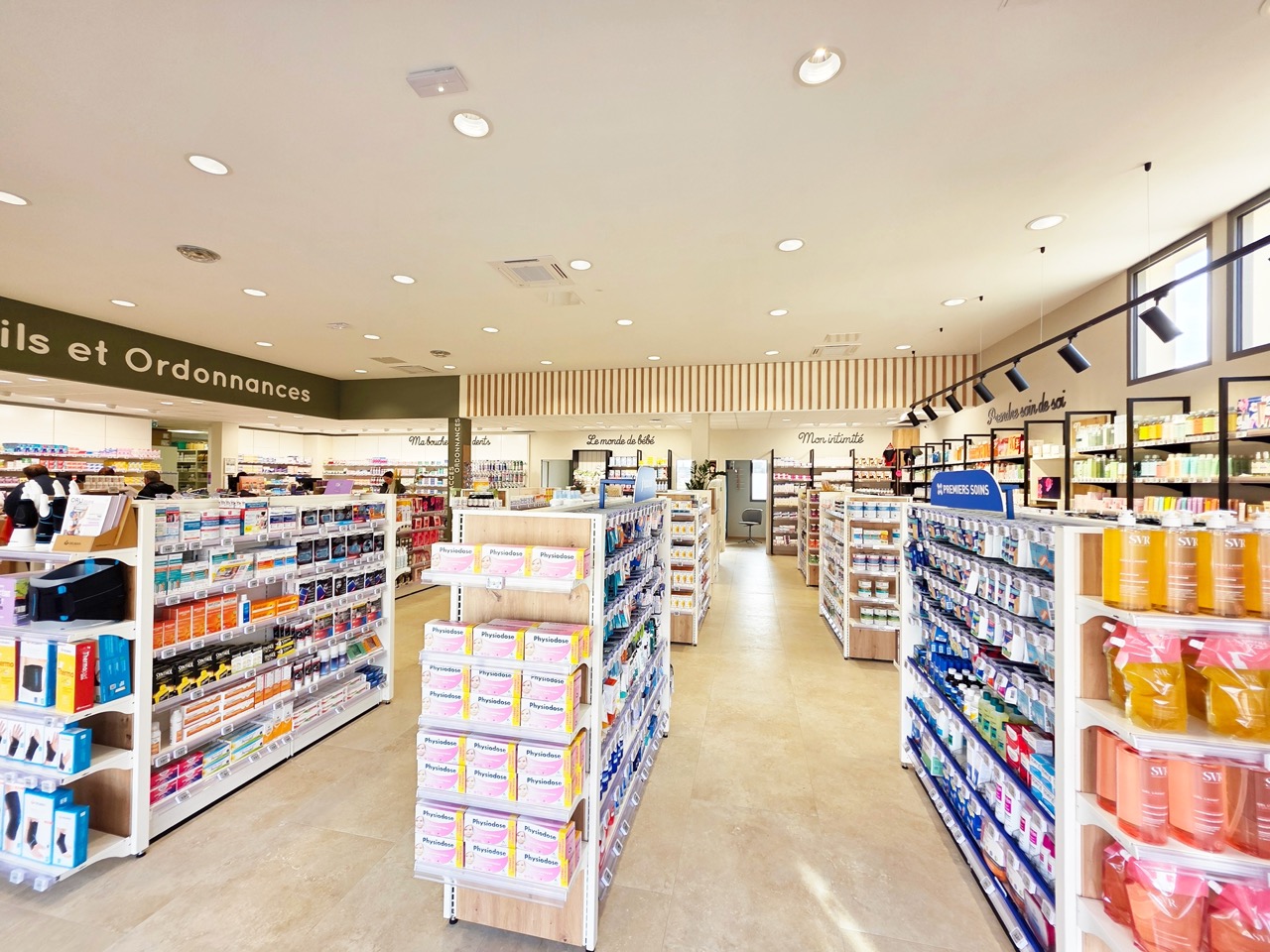 Partir de zéro dans le neuf a permis d’imaginer l’organisation de la pharmacie sans contrainte liée à une structure ou à des aménagements existants. Les volumes ont été conçus pour offrir une officine claire et cohérente. La surface de vente se devait d’être accueillante, lumineuse et moderne. Quant à l’agencement, il a été pensé pour offrir une meilleure lisibilité de l’offre et une circulation fluide pour le public comme pour l’équipe.